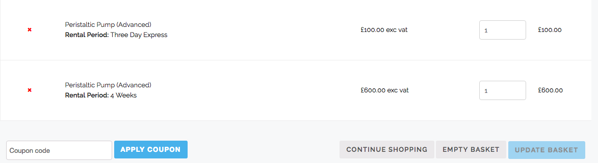 So that’s it! All four technical requirements are met. We have our custom Product data, a rental period input on the Product page, a magic AJAX function and a mechanism for overwriting the cart price. In practice, this allows an Administrator to set up rental products which get cheaper the longer you rent them for, and it allows the customer to specify their desired rental period for every Product they order. Utilising the hook “woocommerce_cart_item_name”, I write out the rental period for each Product in the cart.