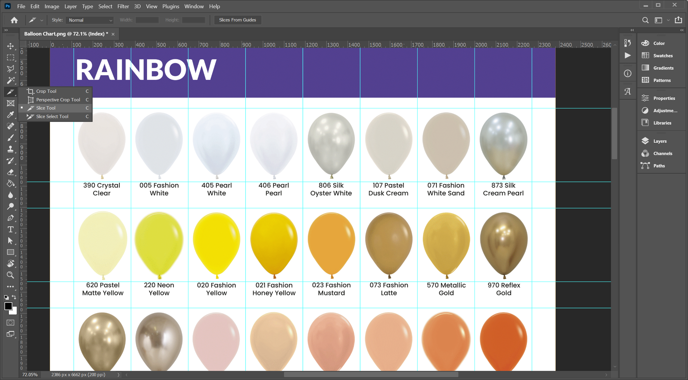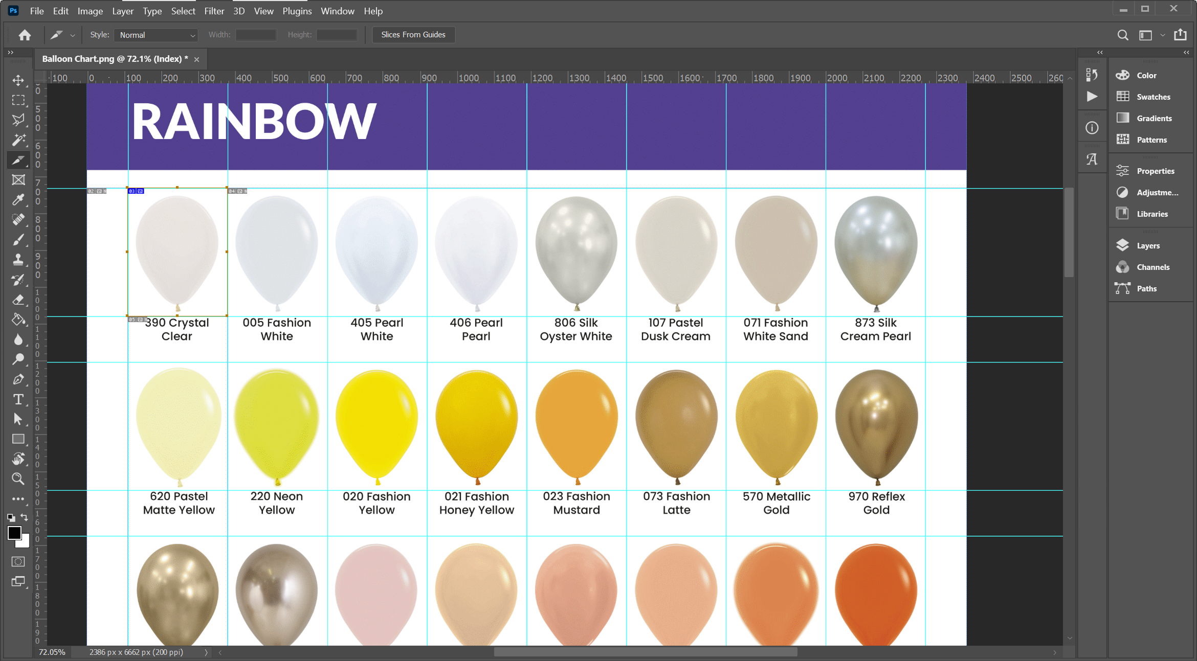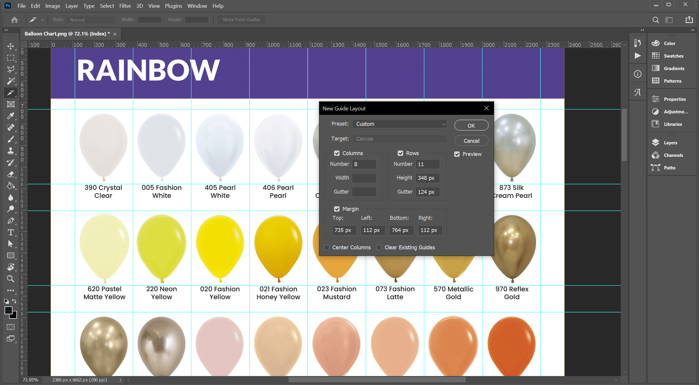 For our example, though, we’re working with a large grid of evenly spaced balloons. To make the slicing process faster and more uniform, we’ll set up a guide layout first.
